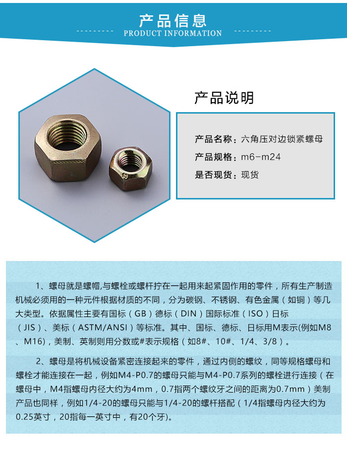 市場上銷售的質量比較好的六角91免费观看视频在螺母的內圓麵鑲有與該六角壓對邊六角壓對邊鎖緊螺母螺紋一致的銅製小塊,用於避免徑向頂緊螺釘直接與被鎖螺紋接觸而損壞後者。這種六角壓對邊六角壓對邊鎖緊螺母在旋轉運動類零件的軸端鎖緊場合逐步開始應用,比如滾珠絲杠安裝端軸承的防鬆。