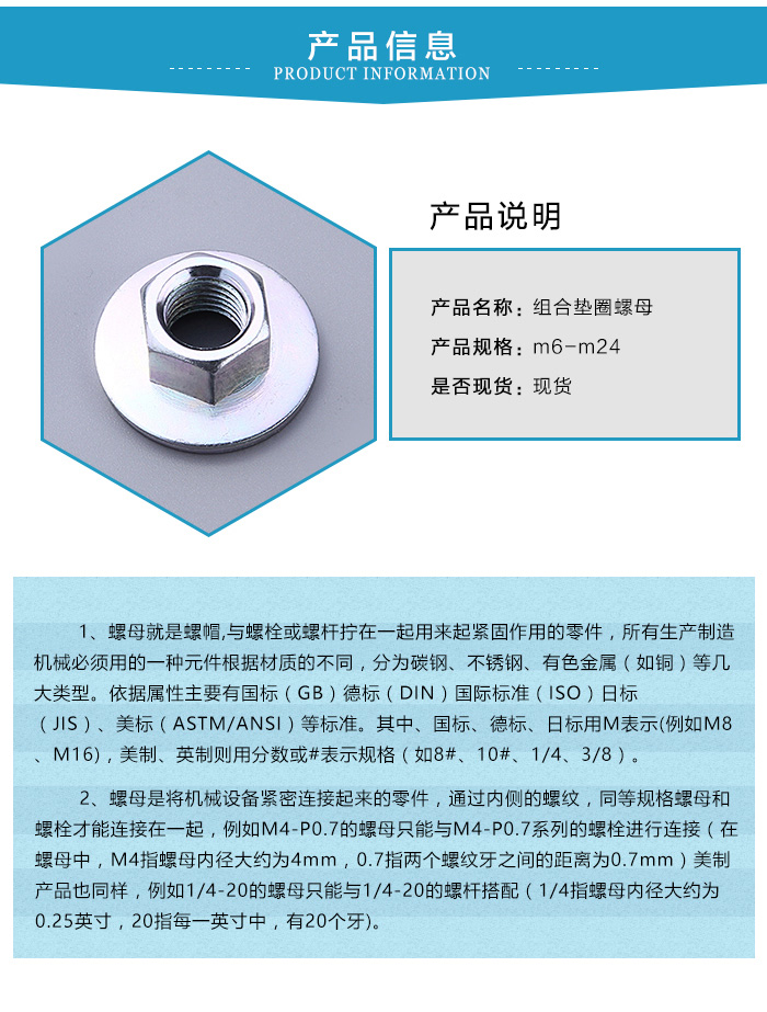一般常見的六角彈墊組合螺母規格大致都在M20以下,因為大部分六角彈墊組合螺母都是用在管道及法蘭盤上,所以受工件約束,六角彈墊組合螺母規格同螺母相比比較少一些。M20以上的一些六角彈墊組合螺母大多為平麵法蘭,就是法蘭麵上沒有齒紋,這些螺母大部分用在一些特殊設備和特殊地方,一般銷售廠家沒有現貨。
