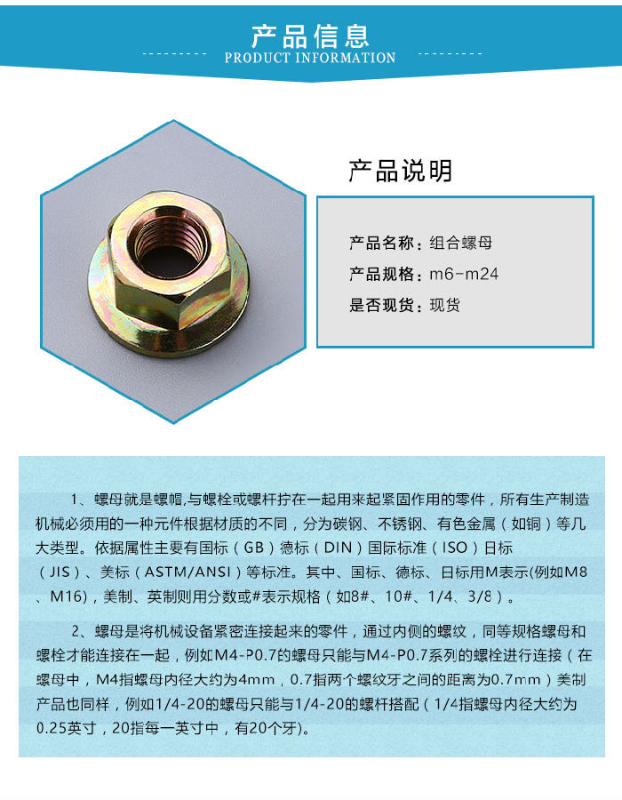 組合螺母的工藝生產,是先把外六角螺栓墩打出來,後在手工或自動穿墊機把彈平墊穿上去。後在搓牙。數量多的話,就用自動穿墊機,數量太少的話,一般都是工人去穿彈平墊。當然組合螺母裏用的彈平墊一般都是專業用來做組合螺釘的。其他常用的彈墊,平墊用來做組合螺釘是不行的。所以很多都是訂製的彈平墊。彈墊的選擇,材質非常重要。要選擇好的彈墊,像Mn65這種材質就不錯。不好的彈墊組合在組合螺釘上,很容易斷掉,或者壓下去了,彈不起來。