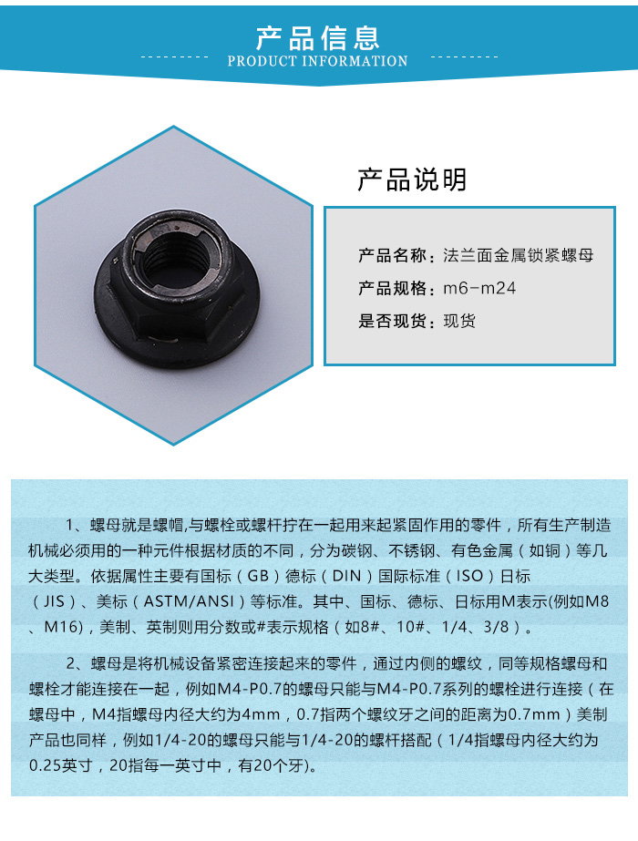 法蘭麵金屬鎖緊螺母是一種新型連接緊固件,法蘭麵金屬鎖緊螺母改變了在薄板上安裝零部件的傳統方式,是板件法蘭麵金屬鎖緊螺母工藝的新突破,不僅可以替代焊接螺母用於薄板結構,以避免薄板焊接變形,而且可用於易變形或不易攻絲的材料結構上。