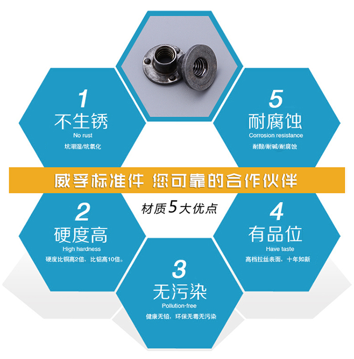 T型焊接螺母,強度比較大,且使用範圍廣,薄厚都可以,但是由於高溫會導致被連接件變形,且不可拆卸,而且一些活潑金屬不能用通常方法焊接,比如鋁,鎂等,需要保護氣或氬弧焊,要求加工工藝和精度。