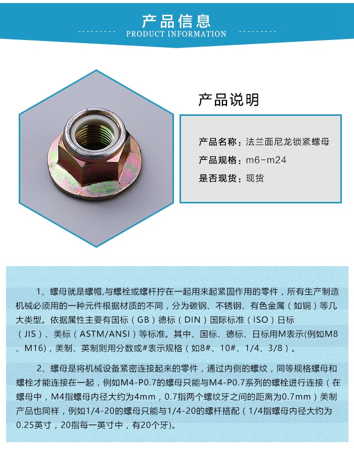 一般常見的法蘭麵尼龍鎖緊螺母規格大致都在M20以下,因為大部分法蘭麵尼龍鎖緊螺母都是用在管道及法蘭盤上,所以受工件約束,法蘭麵尼龍鎖緊螺母規格同螺母相比比較少一些。M20以上的一些法蘭麵尼龍鎖緊螺母大多為平麵法蘭,就是法蘭麵上沒有齒紋,這些螺母大部分用在一些特殊設備和特殊地方,一般銷售廠家沒有現貨。